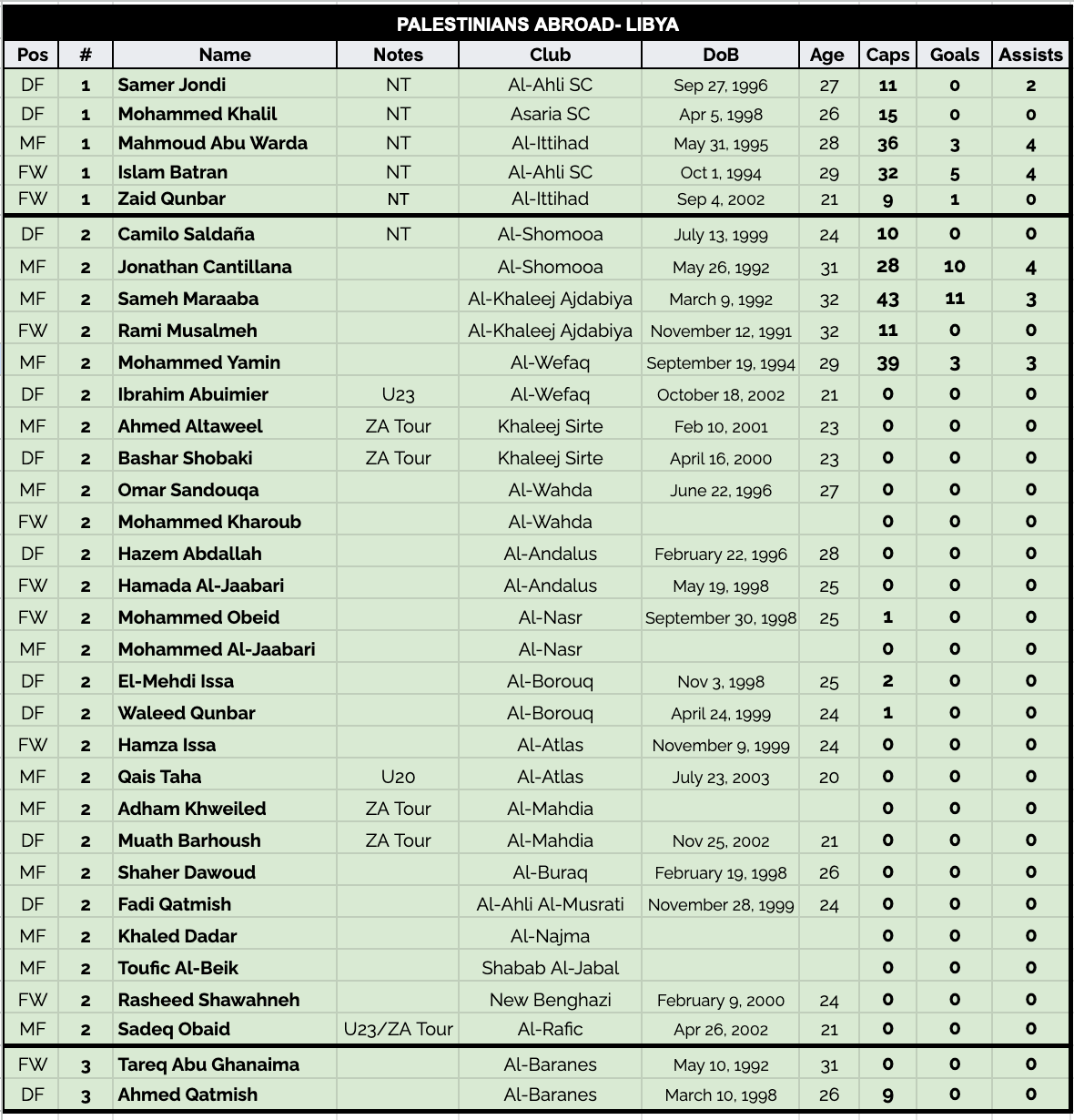32 players; roughly the size of two WBPL squads. That is how many Palestinian players now play in Libya and while the big names have decamped, at least until the end of the season, to the Libyan topflight. Many more are now contracted to teams in Libya’s second tier. A full list of players currently plying their trade in Libya can be found below: