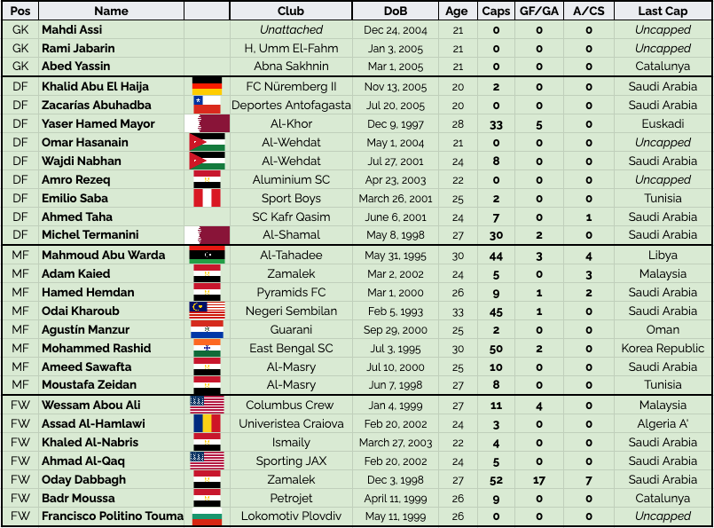 Palestine could have easily put together a 25 or 26 man squad by drawing on its sizable player pool in Egypt, Europe, and the Americas. The travel costs would have been higher but the PFA has money- courtesy of the prize kitty from World Cup qualification and the FIFA Arab Cup.