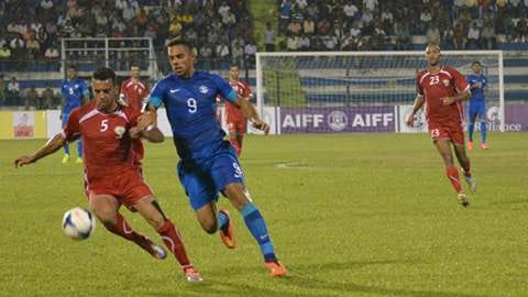 Haitham Dheeb (L) battles for the ball in Palestine's 3-2 victory over India (Oct. 2014)