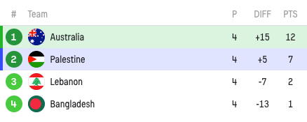 Their march towards history has been assisted by Lebanon who have scored only a single goal over four games. Here is what the standings in Group I look like: