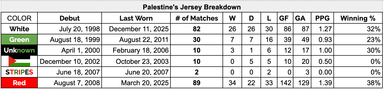 In 2025, Palestine contested 13 matches. On 11 occasions they wore white. The jersey was front and center as Palestine came from behind to beat Iraq 2-1 in World Cup qualification. Over the course of Round 3 of World Cup qualification White was the color of choice for eight of the ten encounters. The team also wore the jersey for all five of their games at the FIFA Arab Cup.